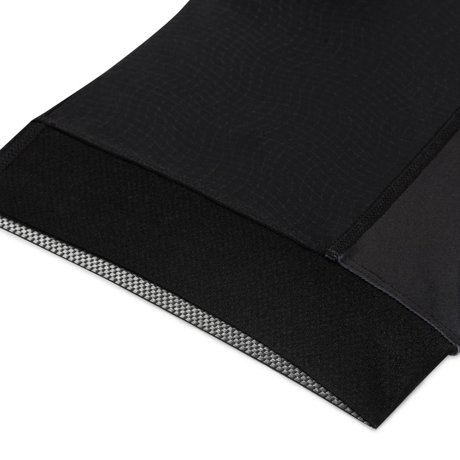 Per l’interno delle cosce, è stato scelto un tessuto nero non stampabile. Questo tessuto è altamente resistente all’usura e garantisce una lunga durata della tuta. Realizzato con 80% poliammide e 20% elastan, mantiene la sua qualità anche dopo migliaia di chilometri di utilizzo intensivo. Minimizza l’usura e il pilling, specialmente durante un contatto prolungato con la sella.