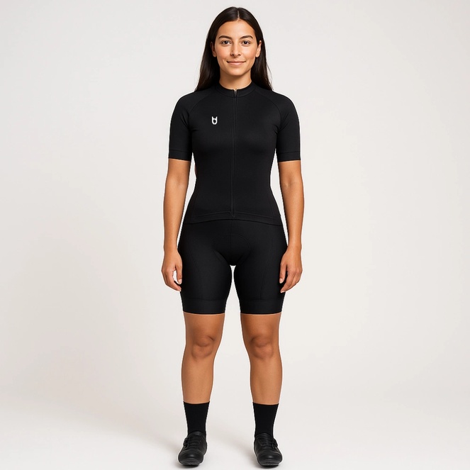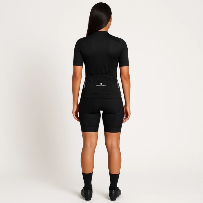 Cyclists wearing custom cycling jerseys in black riding road bikes during group ride in city