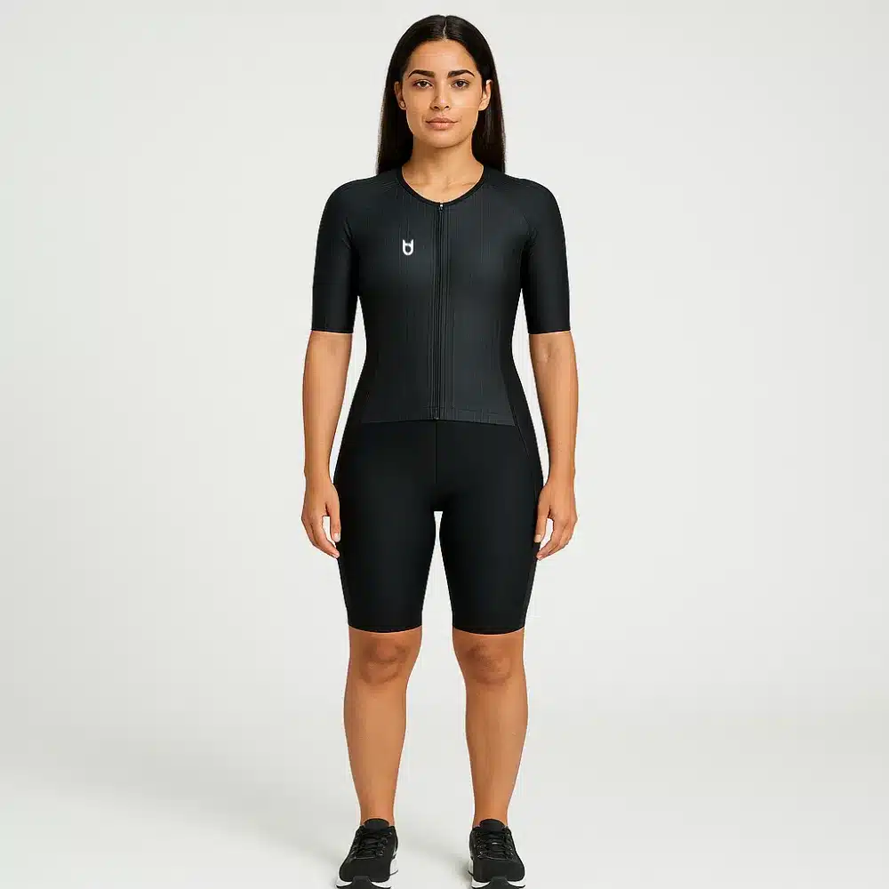 Women's sportswear, evolution TD Sportswear model posing in a trisuit.